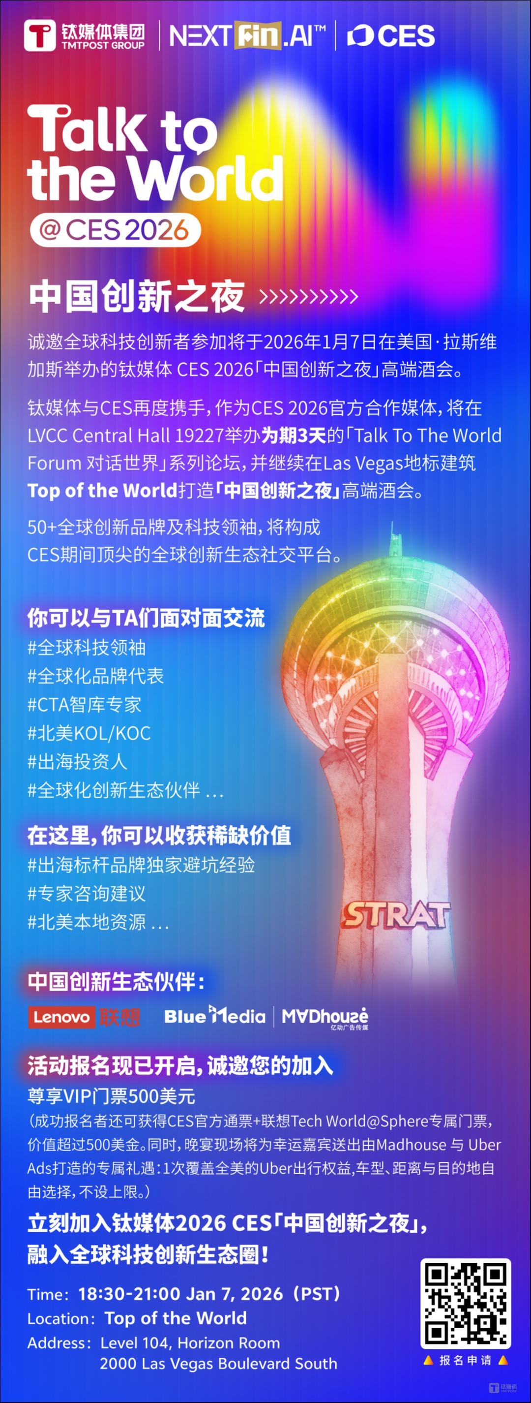 From January 6 to 8 (Pacific Time), the TMTPost “Talk to the World” forum series will run throughout CES 2026. Compared with previous editions, this year’s forums place greater emphasis on AI industrialization, ecosystem building, and the interplay between global strategies and local execution. Discussions will explore diverse pathways for AI adoption across consumer electronics, mobility, industrial applications, and service sectors, while examining the next inflection point following the rapid rise of “AI + hardware.”