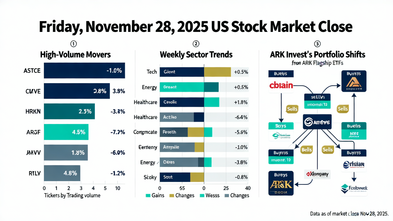 On Friday, November 28, 2025, US equities closed with notable volume and volatility in key AI and tech stocks. The week saw a broad market rebound led by AI-enabled sectors despite November’s overall modest losses. High-profile contracts and earnings shaped sentiments in chipmakers and AI infrastructure stocks. Meanwhile, Cathie Wood’s ARK Invest reduced holdings in AMD, reflecting sector rotation. This report analyzes daily movers, weekly sector performance, and ARK’s portfolio adjustments to gauge market trajectory.